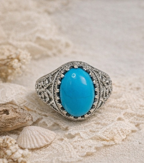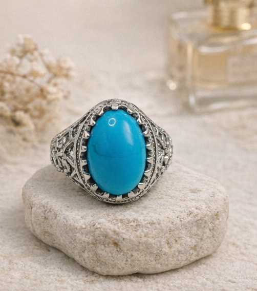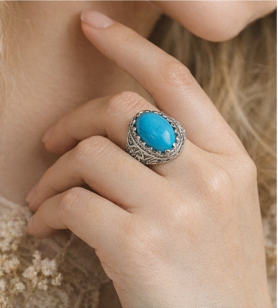 This beautiful vintage turquoise ring features a stunning oval turquoise stone set in solid 925 sterling silver. The intricate filigree design on the band creates a timeless boho elegance that stands out as a unique statement piece.