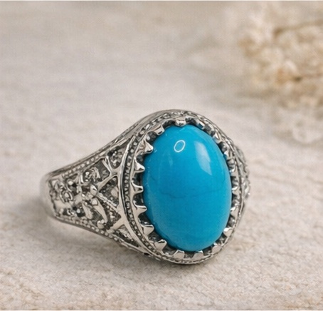 The turquoise stone measures approximately 10 × 14 mm, perfectly balanced with the vintage silver craftsmanship.